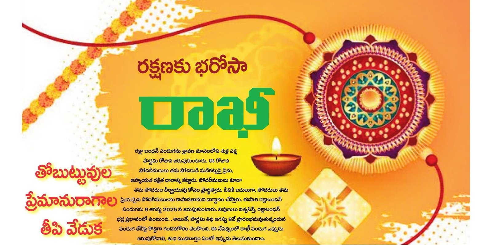 రక్షాబంధన్ అనేది సోదరుడు–సోదరి మధ్య ఉన్న అమూల్యమైన ప్రేమ, అనురాగం, రక్షణ బంధాన్ని వేడుకగా జరుపుకునే పండుగ. ఈ రోజు సోదరీమణులు సోదరుల కళ్లపై రాఖీ కడుతూ, వారి సుఖశాంతులు, ఆయురారోగ్యాలు కోరుకుంటారు. సోదరులు తమ అక్కచెల్లెమ్మలకు ప్రేమాభిమానాలతో బహుమతులు అందజేస్తారు. భారతీయ సాంప్రదాయం, కుటుంబ విలువలు, అనుబంధాలను ప్రతిబింబించే ఈ తీపి వేడుక గురించి వివరంగా తెలుసుకుందాం.